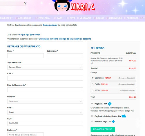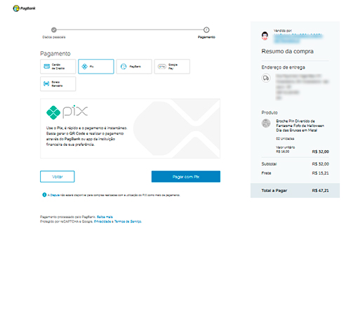 Ao ser redirecionada ao checkout do PagBank, confirme suas informações e escolha a forma de pagamento.