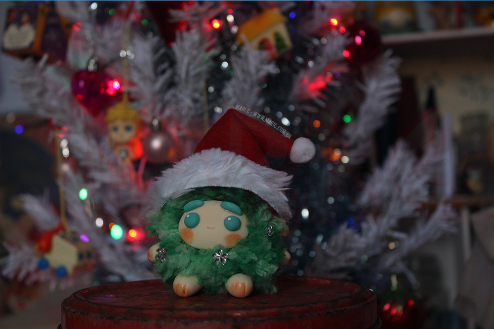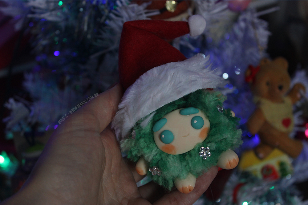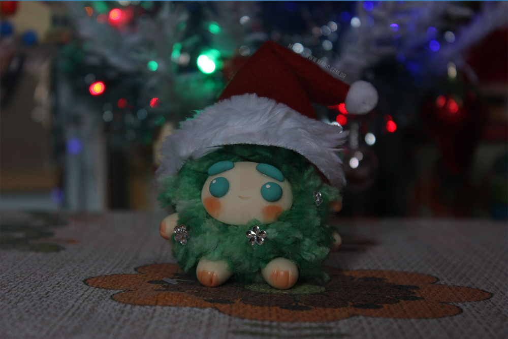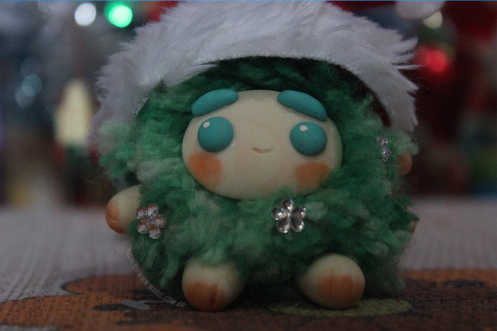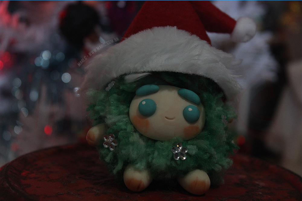 Seu corpinho é macio como pompom de veludo verde-pistache, com reflexos cintilantes que lembram enfeites antigos. Seus olhinhos brilham como bolas de Natal esquecidas no fundo da caixa, e quando ele sorri, pequenas luzes suaves piscam ao seu redor, como se o tempo tivesse parado por um instante.
